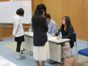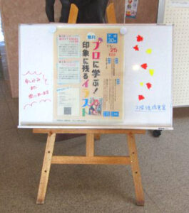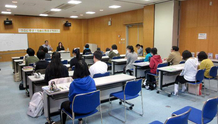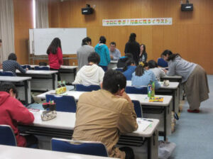 どんなイラストが魅力的に見えるのか、今すぐにでもできる「イラストを描く際のポイント」、「もしもイラスト関連のお仕事をしたい時に考えたいこと・やるべきこと」などをお話しました。ワークショップでは実際にイラストを描いていただき、希望者には持参いただいたイラストを拝見して一人ひとりとお話させていただきました。たくさんの質問もしていただき、実りある時間となりました。